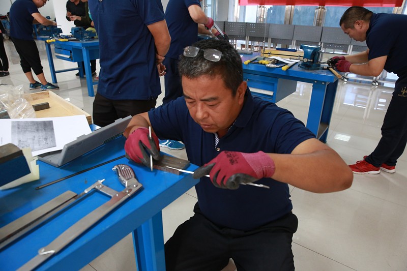 上午8:30,機(jī)修工技術(shù)比武正式開始,考核人員將圖樣發(fā)放給參賽人員,要求在規(guī)定時(shí)間內(nèi)按照?qǐng)D樣進(jìn)行凹凸體零件的制作。參賽人員按照規(guī)定的操作流程首先加工外廊基準(zhǔn)面、劃出凹凸體加工線、鉆4—3工藝孔,接著加工凹凸體、用鉆頭鉆出排孔、并鋸去凹部分多余料,然后銼至接近尺寸、細(xì)銼凹部頂端面及兩側(cè)垂直面、全部銳邊倒鈍、并檢查尺寸精度,最后,檢查凹凸體的配合精度。每個(gè)操作環(huán)節(jié)大家都認(rèn)真細(xì)致、嚴(yán)謹(jǐn)規(guī)范,對(duì)自己高標(biāo)準(zhǔn)嚴(yán)要求。隨后,評(píng)委根據(jù)參賽人員的完成時(shí)間、是否達(dá)到圖紙的要求以及《機(jī)修工技能操作配分標(biāo)準(zhǔn)》進(jìn)行現(xiàn)場(chǎng)打分。