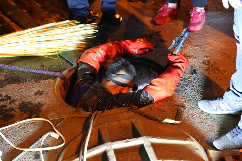 漏點(diǎn)冒出的水溫高達(dá)90℃,搶修人員掀起蓋板,用風(fēng)扇向人井內(nèi)吹風(fēng)降溫,隨后冒著被燙傷的危險(xiǎn)進(jìn)入人井中搶修,但由于伸縮器和管道都腐蝕嚴(yán)重,狹小的空間無法更換伸縮器。為了保障用戶的溫暖,用最快的速度排除故障,分公司領(lǐng)導(dǎo)決定破路開溝,擴(kuò)大作業(yè)面,于是及時(shí)調(diào)來的挖掘機(jī)一直挖到凌晨4點(diǎn)才拓展出一個(gè)能夠滿足施工要求的空間。